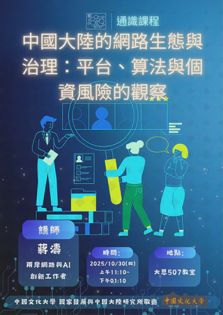 通識課程講座 主題:中國大陸的網路生態與治理 講師:蔣濤 主辦:中國文化大學 國家發展與中國大陸研究所 日期:2025年10月30日 時間:11:10 - 13:10 地點:大恩507教室